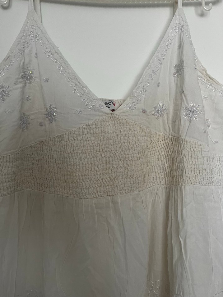 Boncuk işlemeli, nakışlı, keten kumaştan yapılmış, V yakalı, askılı ve bol kesim beyaz uzun elbise. Bel bölgesinde sararma mevcut yıkanırsa geçebilir