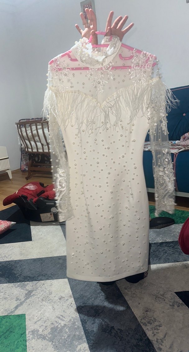 Boncuk İşlemeli Beyaz Uzun Kollu Abiye Elbise