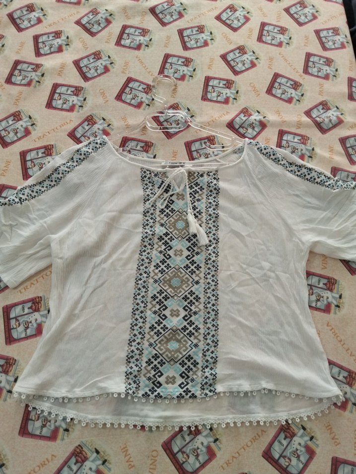 Boncuk işlemeli ve nakış detaylı, uzun kollu, beyaz, bol kesim kısa bluz. Yuvarlak yakalı, bohem tarzı için uygun.