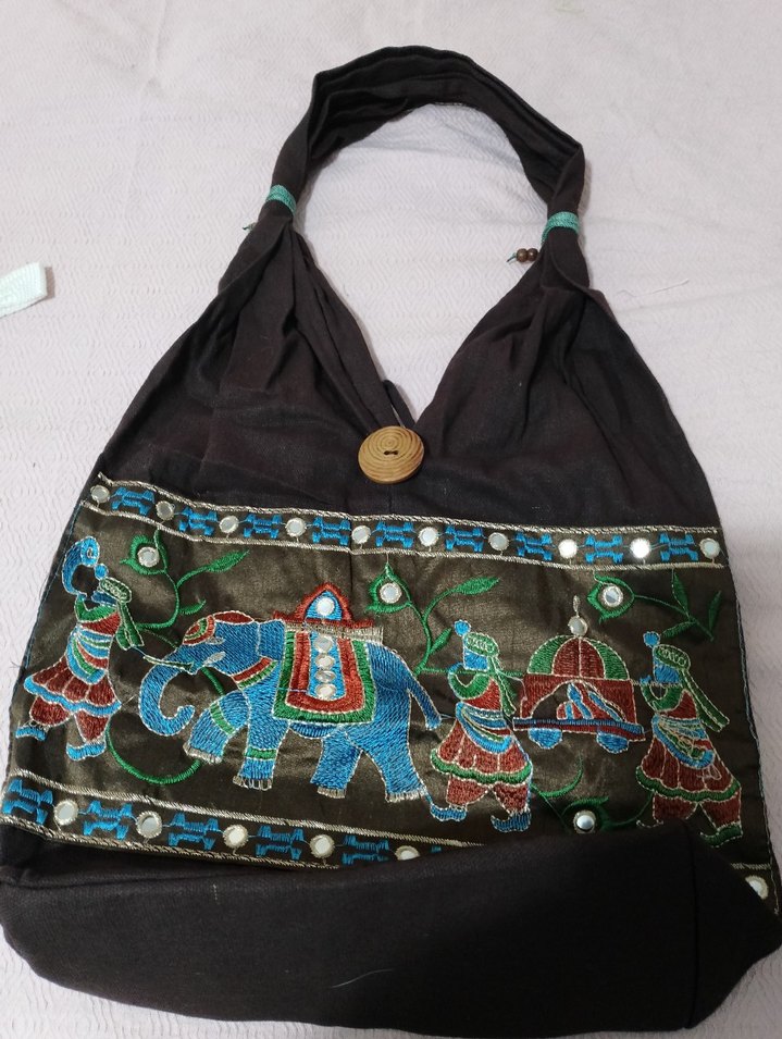 Boncuk işlemeli, çok renkli nakış detaylı, koyu renkli tekstil malzemeden yapılmış bohem kadın çantası. Yumuşak kumaş ve düğmeli kapanışa sahiptir.