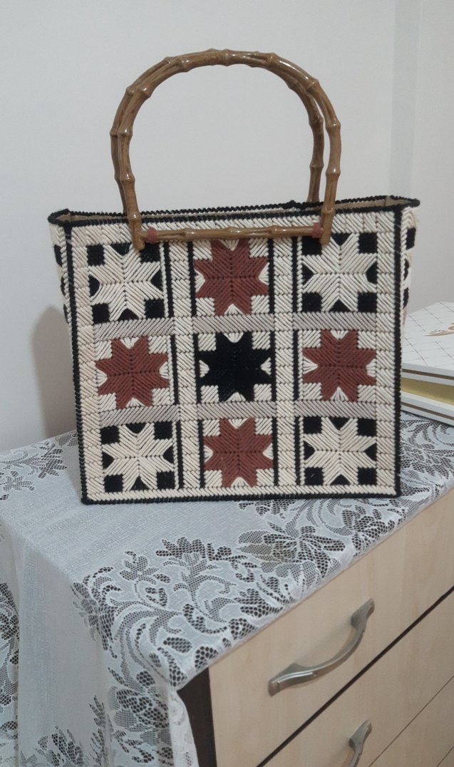 Boncuk işlemeli, koyu renkli çok renkli işlemeli yıldız desenli örgü bohem kadın çantası. Bambu saplı, günlük kullanıma uygun.