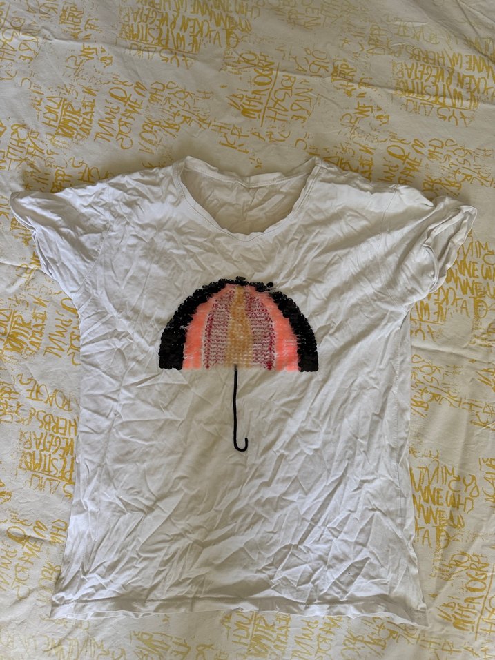 Açık renkli, boncuk işlemeli şemsiye desenli kadın tişörtü. Çok renkli, bohem tarzda, retro ve avangard havası taşıyor. ☂️ s m uyumlu