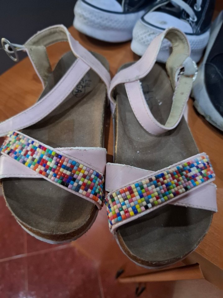 Boncuk işlemeli, pastel renkli kayışlara sahip bohem tarzda kız sandaletleri. Rahat kauçuk tabanlı, retro ve hippie stil için uygundur. 28-29 no