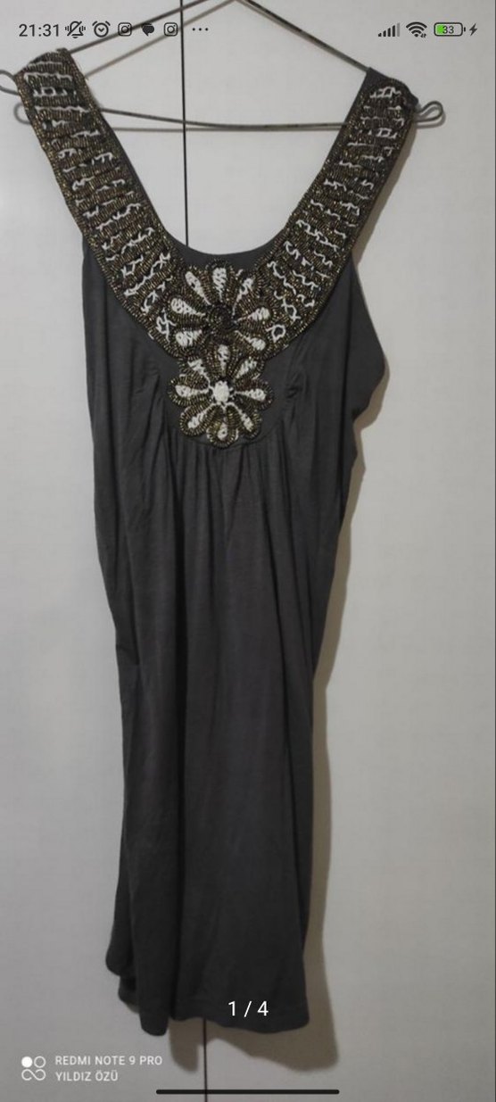 salaş bikini üstüne dökümlü bluz mini elbise, koyu gri kumaş ve detaylı boncuk işlemeleriyle bohem tarzı sunar.