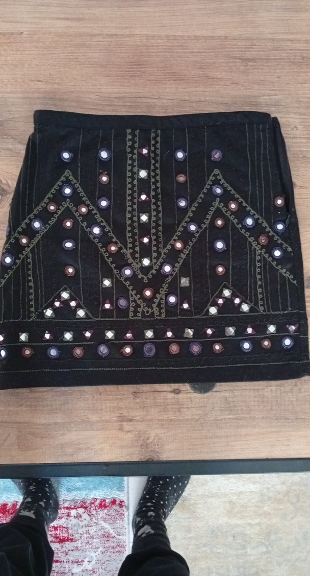 Koyu renkli tekstil kumaş üzerinde işlemeli desenler ve renkli boncuklarla süslenmiş, bohem tarzda dar kesim mini etek. ✨