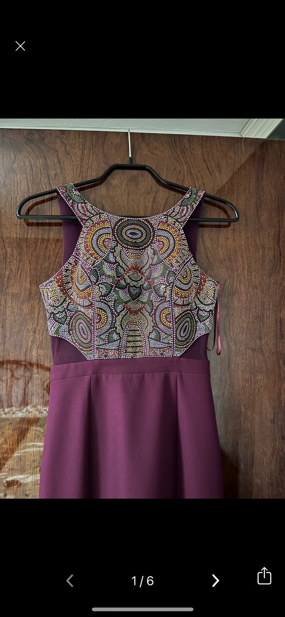 Boncuk işlemeli nakış detaylı, kolsuz, bohem tarzda dar kesim uzun abiye elbise. Koyu mor renkte, düğünler için uygun.