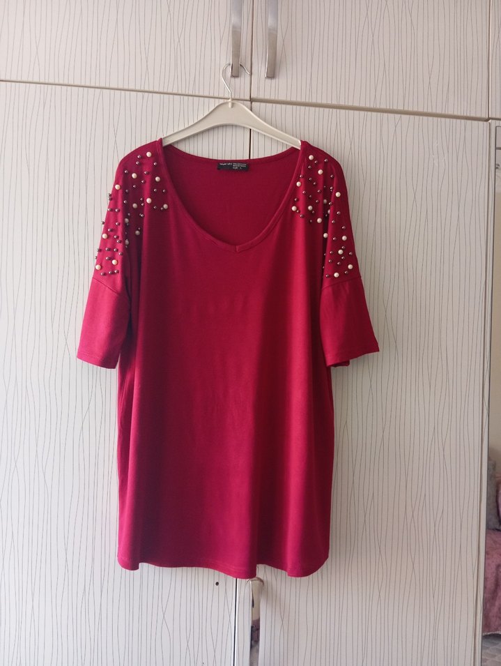 Boncuk işlemeli omuz detaylı, kısa kollu ve V yakalı bordo bluz. Rahat kesim ve midi boyda, yumuşak dokulu kumaştan günlük kullanıma uygun. ✨ 2 koltuk arası 58 cm boy 69 cm