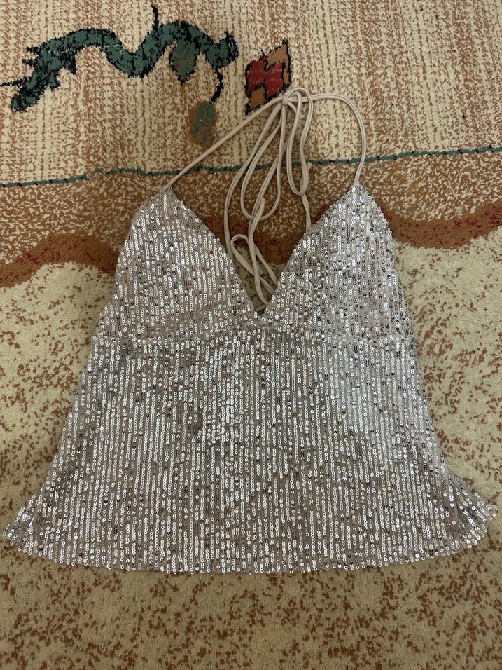 Fitted kesim, V yaka ve ince askılı bej renkli triko atlet, boncuk işlemeli detaylara sahip. Uzun boy ve bohem tarzıyla parti için uygun. ✨