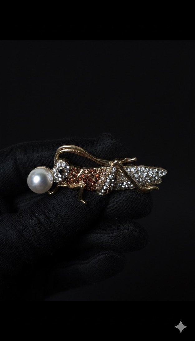Boncuk işlemeli çekirge, inci detaylı altın renkli çağdaş broş, günlük kullanıma uygun. SIFIR ÜRÜN