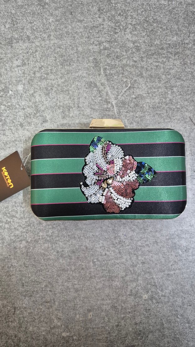 Koyu yeşil-siyah çizgili saten kumaş boncuklu ve işlemeli çiçek detaylı clutch çanta. ürün kullanılmadı sıfır etiketlidir.