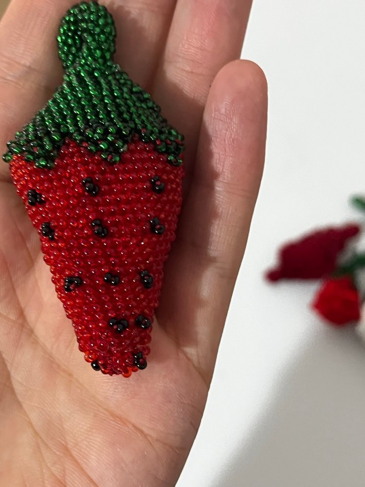 Boncuk işlemeli, renkli çilek şeklinde broş. Bohem tarz için uygun.