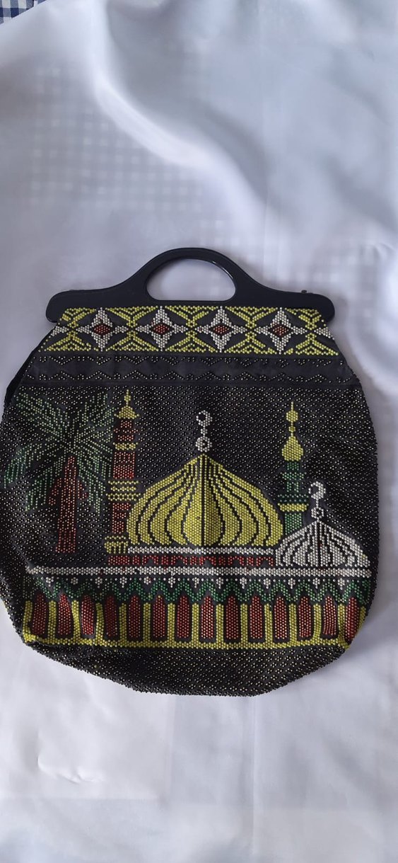 Kadın çantası, boncuk işlemeli ve nakışlı desenlere sahip tekstil malzemeden yapılmıştır. Koyu, çok renkli ve geleneksel bohem tarzda, sağlam saplıdır. Günlük kullanıma uygundur. 1970 lerden