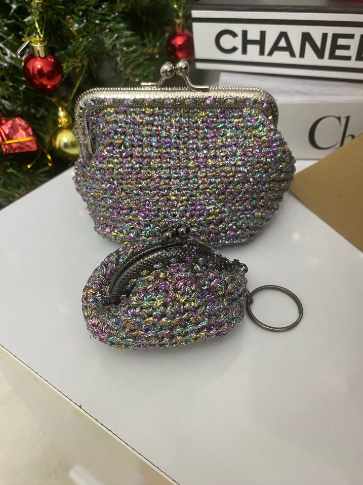 Boncuk işlemeli, çok renkli örme kumaştan yapılmış kadın cüzdanı. Yılan desenli ve anahtarlıklı küçük bozuk para cüzdanı ile birlikte. Günlük kullanıma uygun.