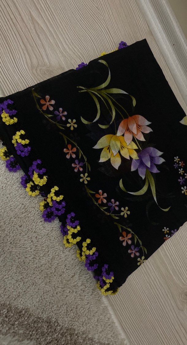 Kadınlar için çok renkli çiçek desenli, boncuk işlemeli kenarları olan koyu renk tekstil fular.