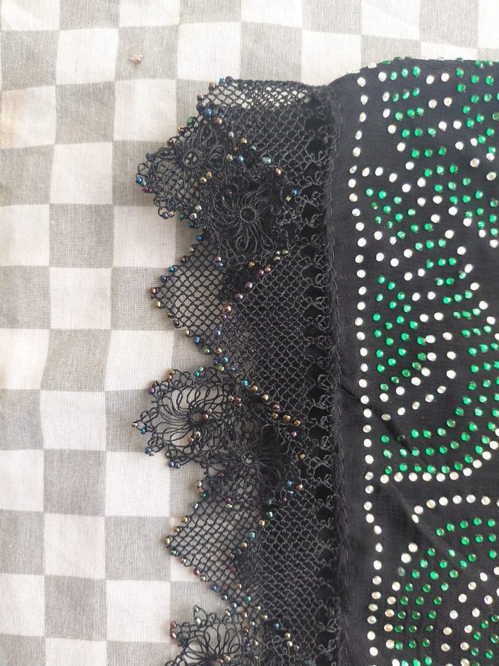 Kadın fuları, boncuk işlemeli çok renkli detaylar ve dantel kenarlarla bohem ve avangart tarzı yansıtıyor. ✨
