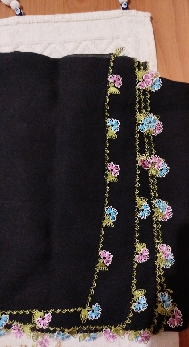Koyu renkli örme kumaş üzerine çok renkli boncuk işlemeli çiçek detaylarıyla bohem tarzda kadın şalı.