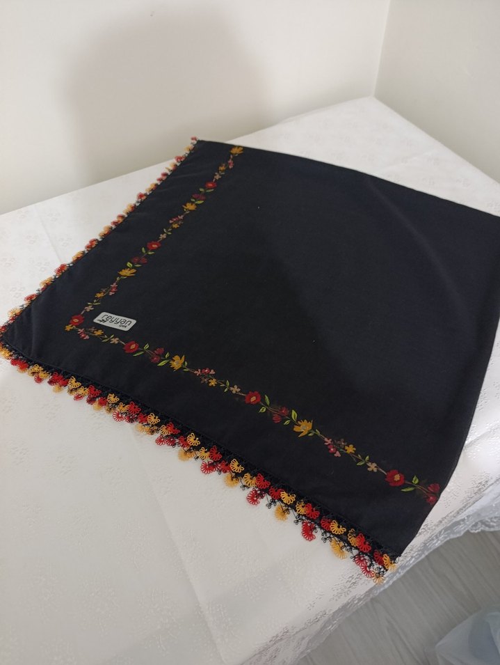 Koyu renkli tekstil kadin şal, çok renkli boncuk işlemeli kenarları ve çiçek desenli nakışı ile bohem ve retro tarzını yansıtıyor.