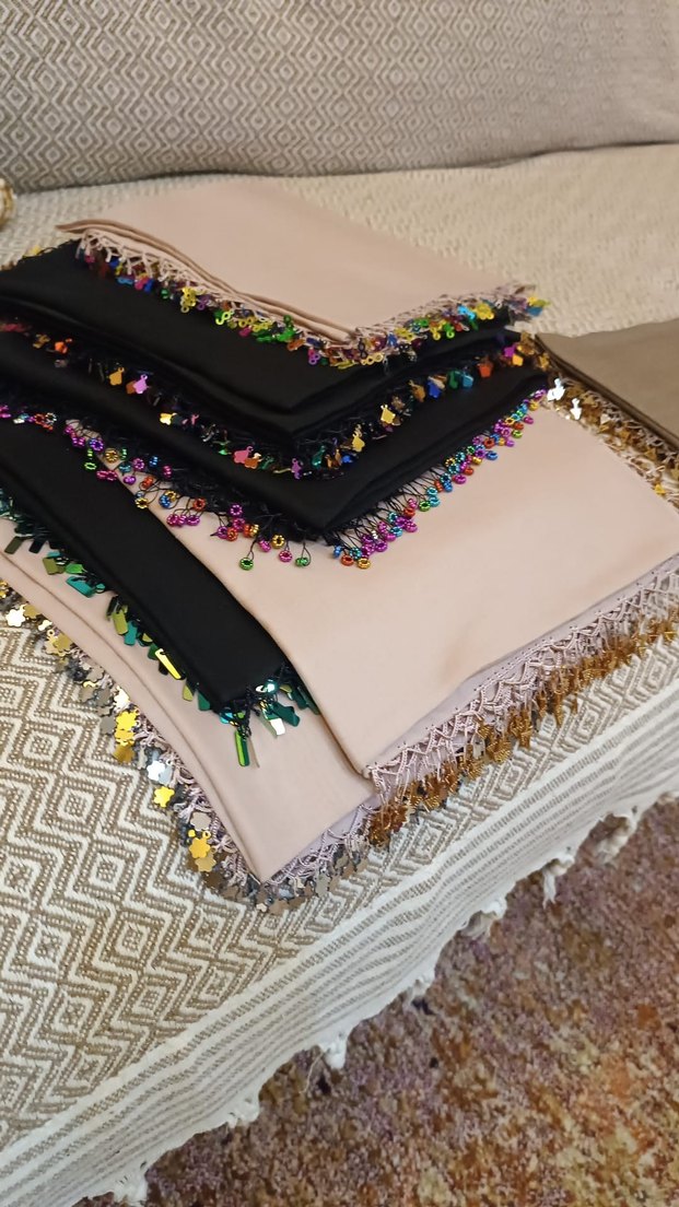 Boncuk işlemeli, çok renkli kadın şa. Kumaştan yapılmış, kenarları boncuklla süslenmiş, bohem ve retro tarzda.