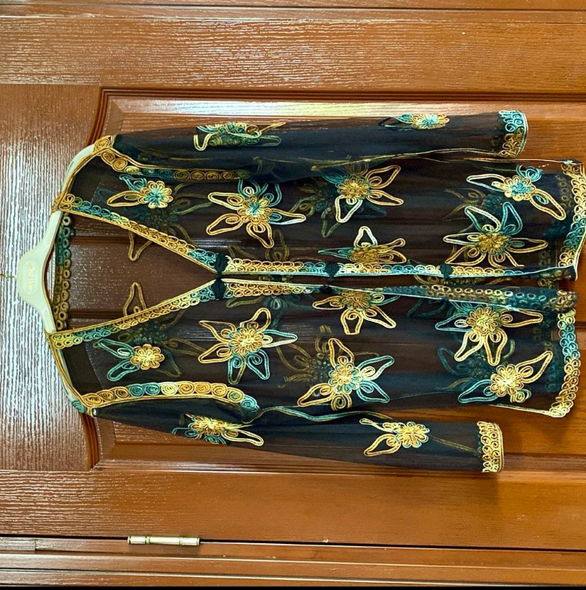Sarı işlemeli uzun bohem kadın abiye ceketi . Regular kesim, tülden kolları ile düğünler için ideal