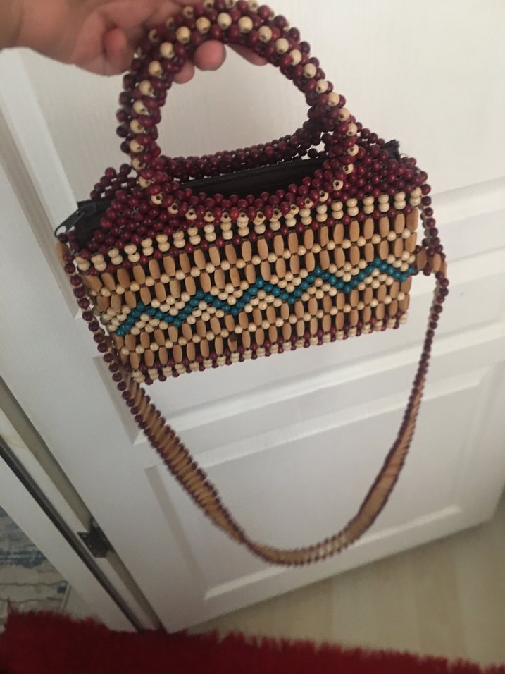 Etnik desenli, boncuk işlemeli örgü kadın çanta. Üst sap ve uzun askısı ile günlük kullanıma uygun, bohem tarzda bir model.