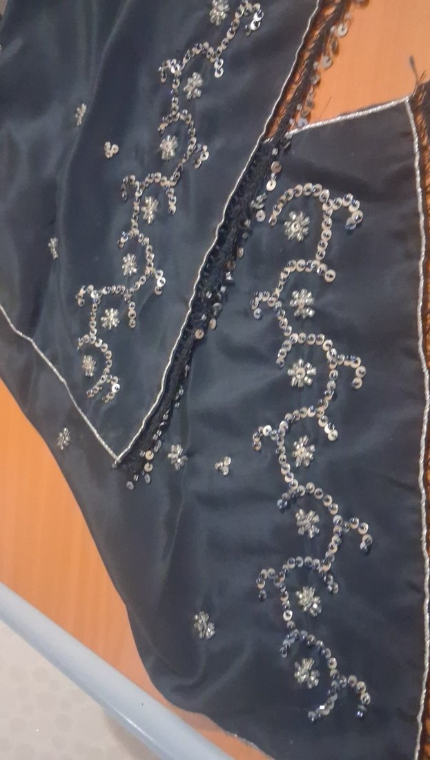 Parlak siyah kumaştan yapılmış, pul boncuk işlemeli ( El işlemesi) çiçek desenlerine sahip kadın fular. vintage ve modaya uygun tarzı bir araya getiriyor. ölcüler 110× 30 cm dir.