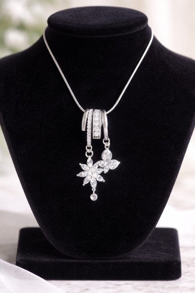 Boncuk işlemeli, gri ve beyaz renklerde kadın kolye. Minimalist ve çağdaş tasarıma sahip, düğünler için uygun zarif çiçek şeklinde kolye ucu.