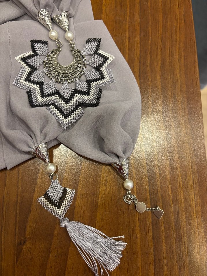 Boncuk İşlemeli Gri Bohem Kadın Şal