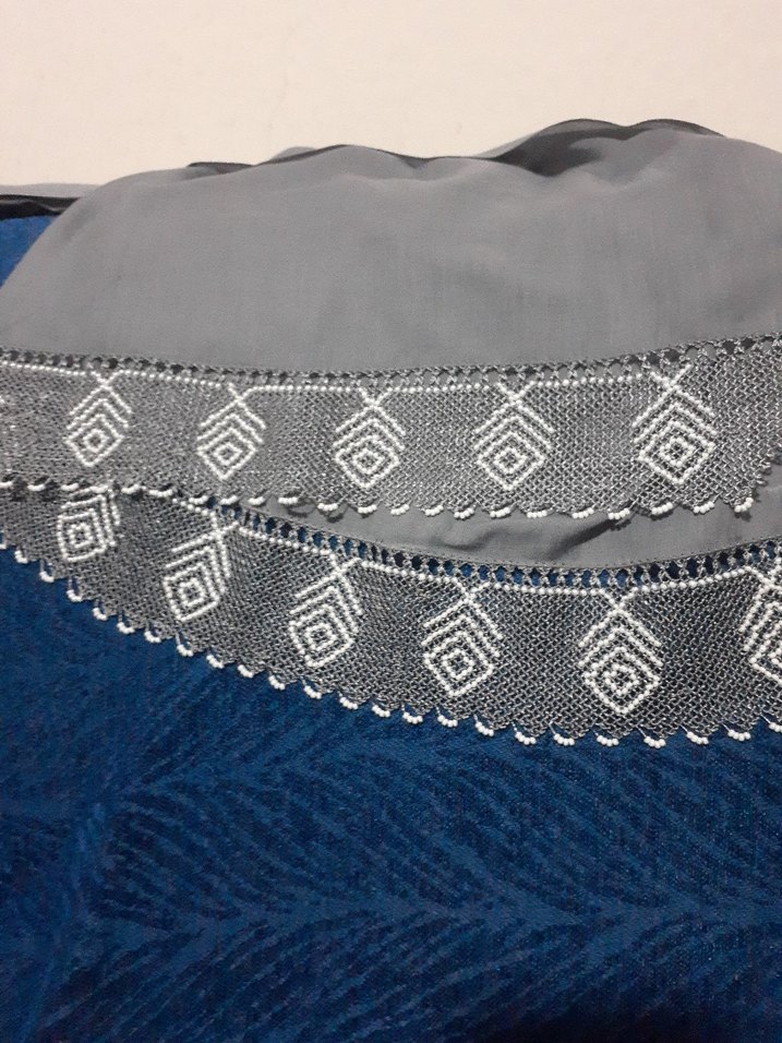 Yumuşak gri kumaştan, boncuk işlemeli geleneksel tarzda kadın tülbenti. Bohem ve retro stiller için uygundur.