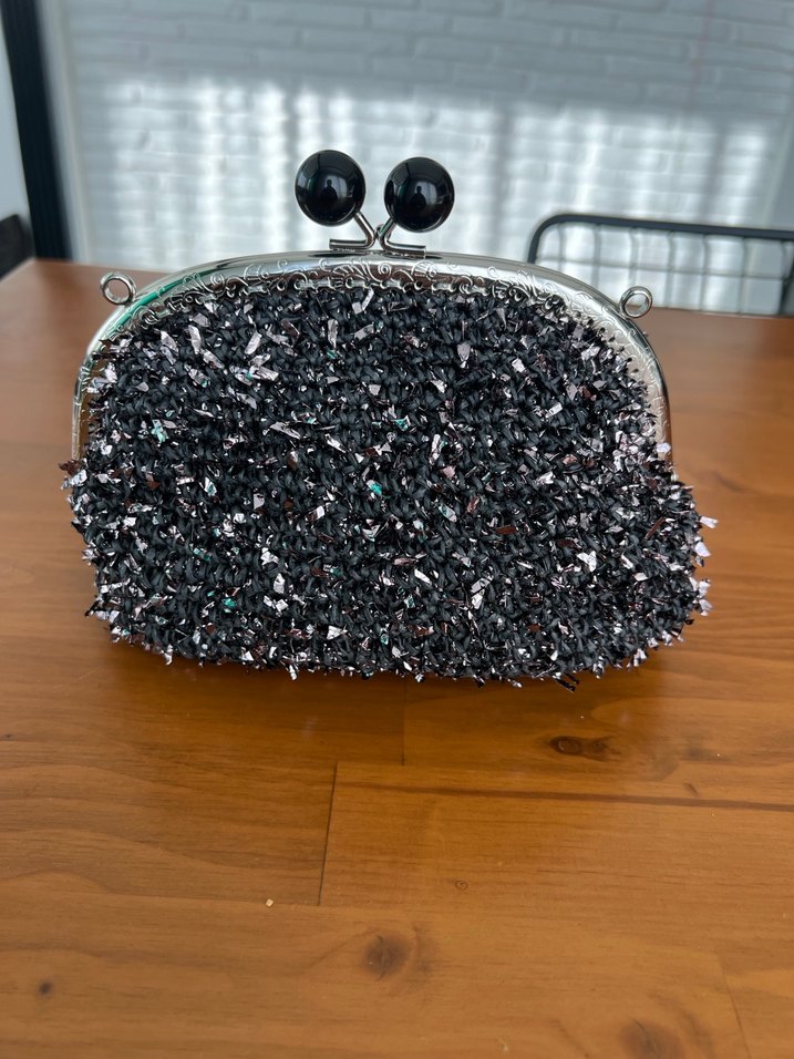 Kadınlar için koyu gri örgü kumaştan, boncuk işlemeli, metal çerçeveli ve çıtçıtlı kapamalı portföy çanta. Günlük kullanıma uygun, gotik ve nostaljik tarzda.