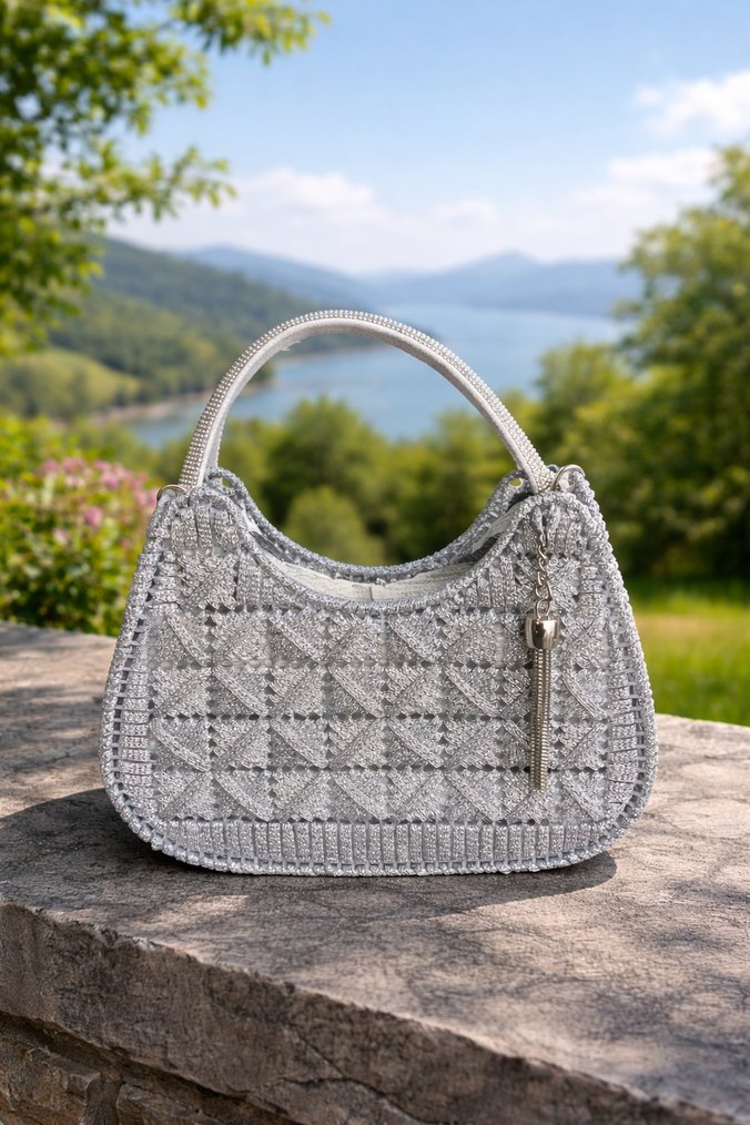 Boncuk İşlemeli Gri Triko Kadın Çanta