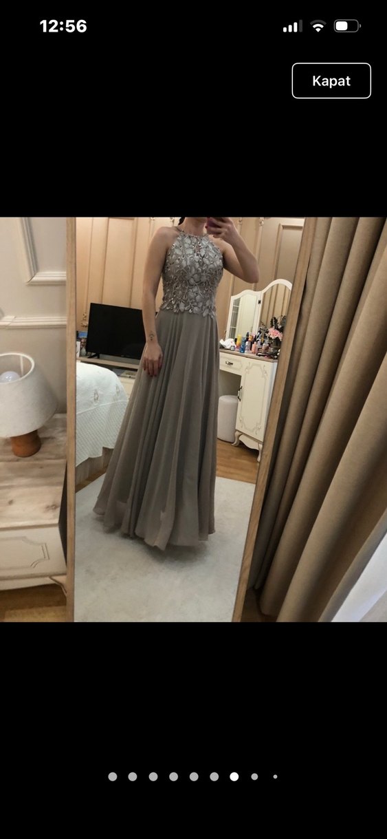 Boncuk İşlemeli Gri Uzun Abiye Elbise