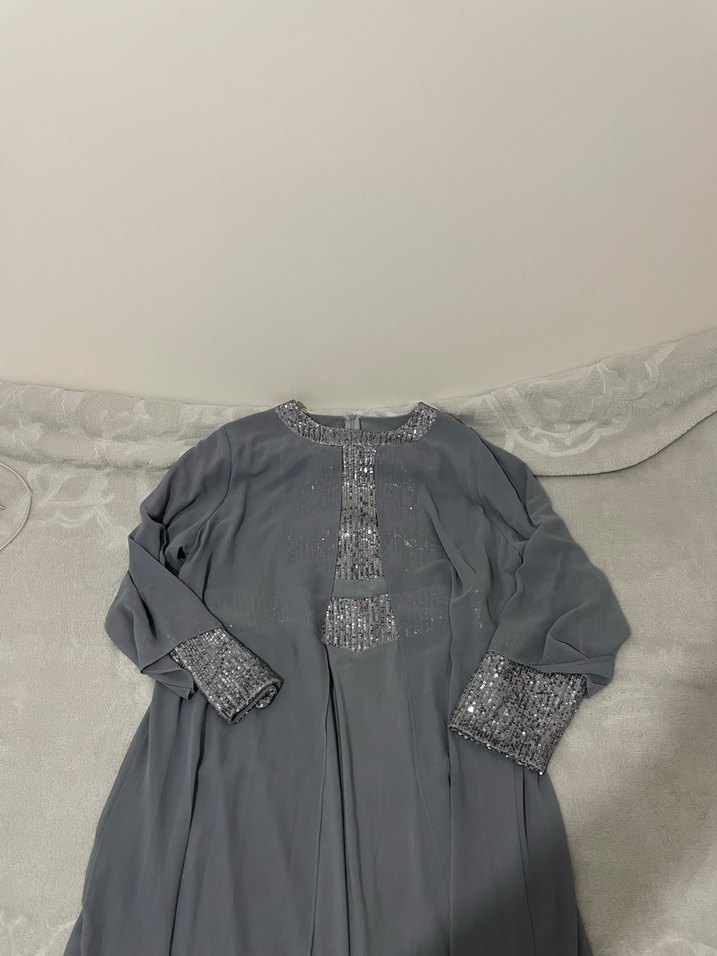 Bol kesim, uzun gri elbise, yuvarlak yakalı ve uzun kolludur. Yumuşak sentetik kumaştan yapılmış, yakası ve manşetleri boncuk işlemelidir. Minimalist ve mütevazı tarza uygundur.