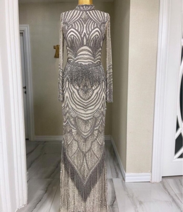 Boncuk işlemeli yılan desenli gri uzun abiye elbise, tekne yaka ve uzun kollu, rahat kesim sunar. ✨