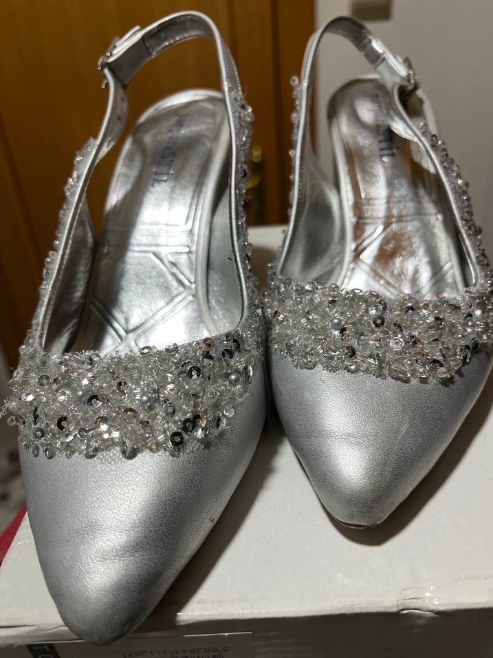 Gri, boncuk işlemeli ve metal görünümlü yüksek topuklu kadın ayakkabısı. Klasik ve zarif stil, düğün için uygun.