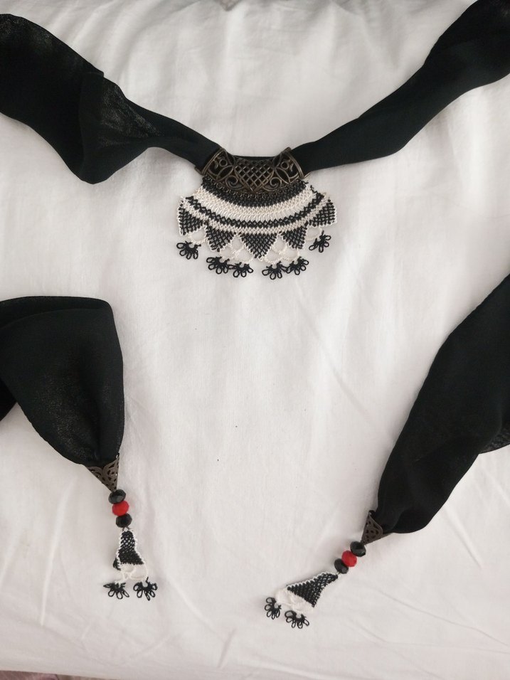 Boncuk işlemeli iğne oyali desenlere sahip siyah uzun kadın kolyesi, bohem ve retro tarzda. Yumuşak krep kumaş bağlama detaylı, günlük kullanıma uygun.