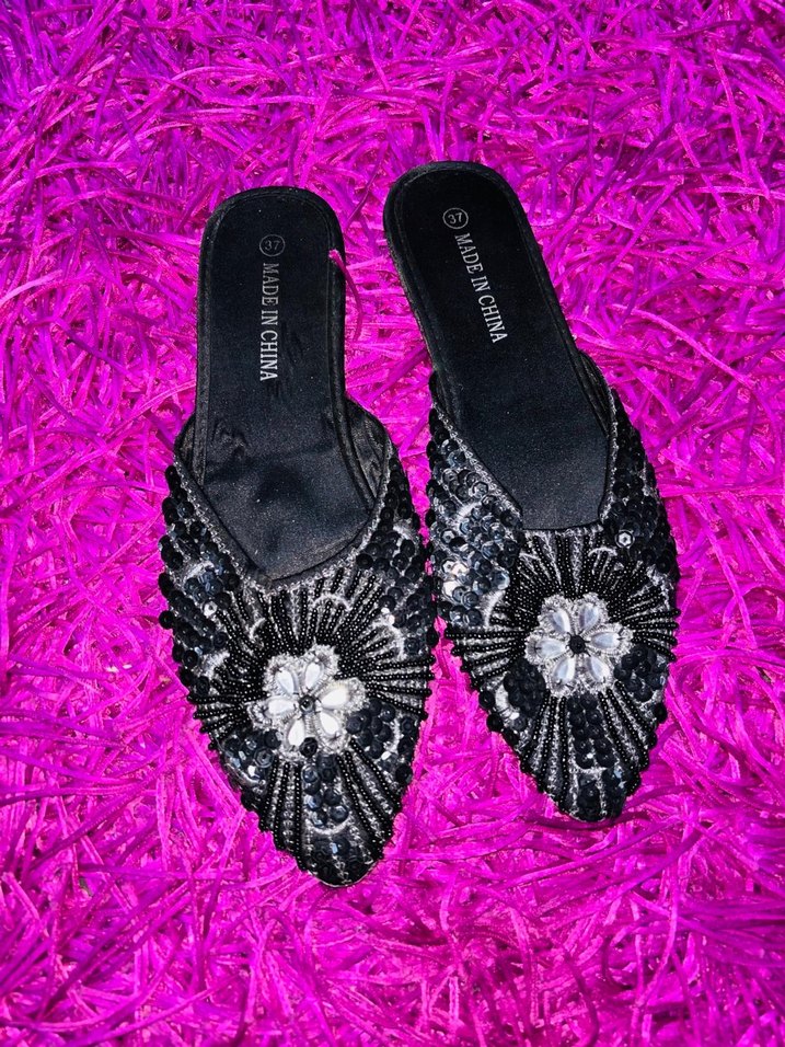 Kadınlar için dolgu topuklu, siyah boncuk işlemeli ve çiçek desenli terlik, kauçuk tabanlı, bohem ve retro tarza uygun.