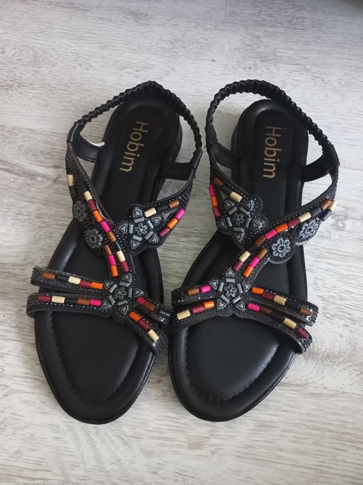 Renkli boncuk ve işlemeli detaylara sahip, dolgu topuklu kadın sandalet. Kauçuk malzemeden, günlük kullanım için uygundur. Marka: Hobim hiç kullanılmadı