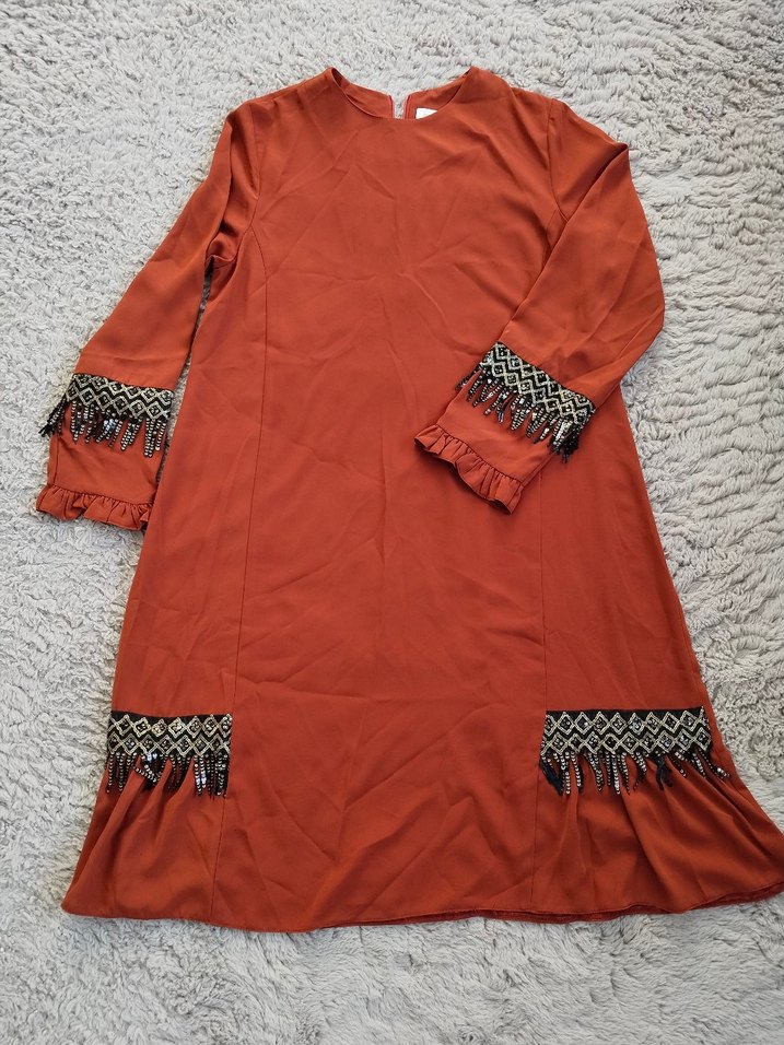 Uzun, kahverengi, bol kesim ve kayık yaka tunikte kol ve etek ucunda renkli işlemeli ve boncuk detaylar bulunur, bohem tarz için uygun.