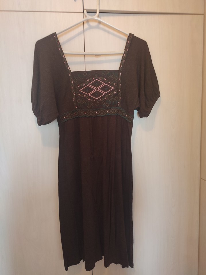Boncuk işlemeli, geniş kesim kahverengi bohem elbise. Yumuşak triko kumaştan, tekne yaka ve kısa kabarık kollu, günlük kullanım için uzun boy.