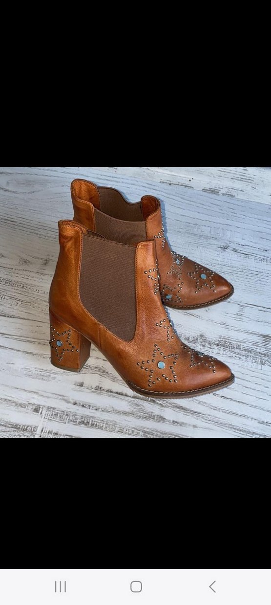 Parlak kahverengi deri, blok topuklu botlar, işlemeli ve boncuk detaylı, bohem tarzda. Günlük kullanım için uygundur.