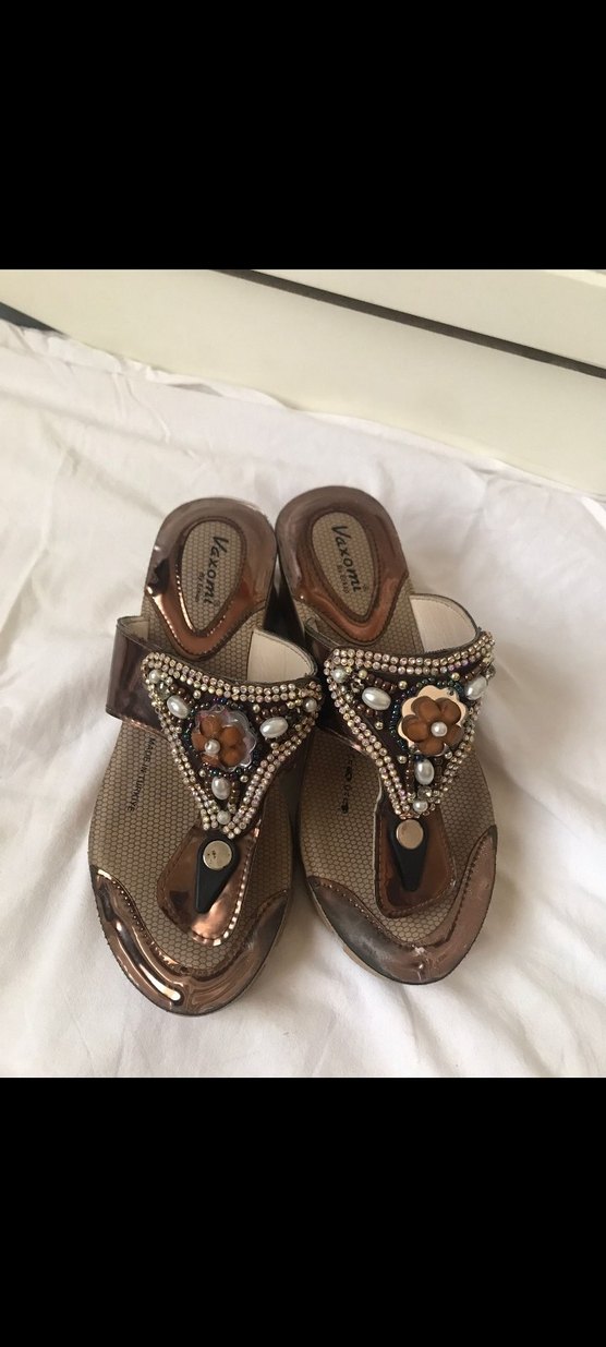 Boncuk işlemeli ve desenli, parlak görünümlü kahverengi dolgu topuklu terlikler. Kauçuk tabanlı, retro ve bohem tarzına uygun.