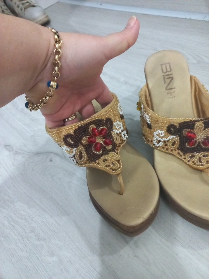 Kahverengi dolgu topuklu, lastik malzemeden, boncuk işlemeli sandalet. Bohem düğün tarzına uygun. ✨