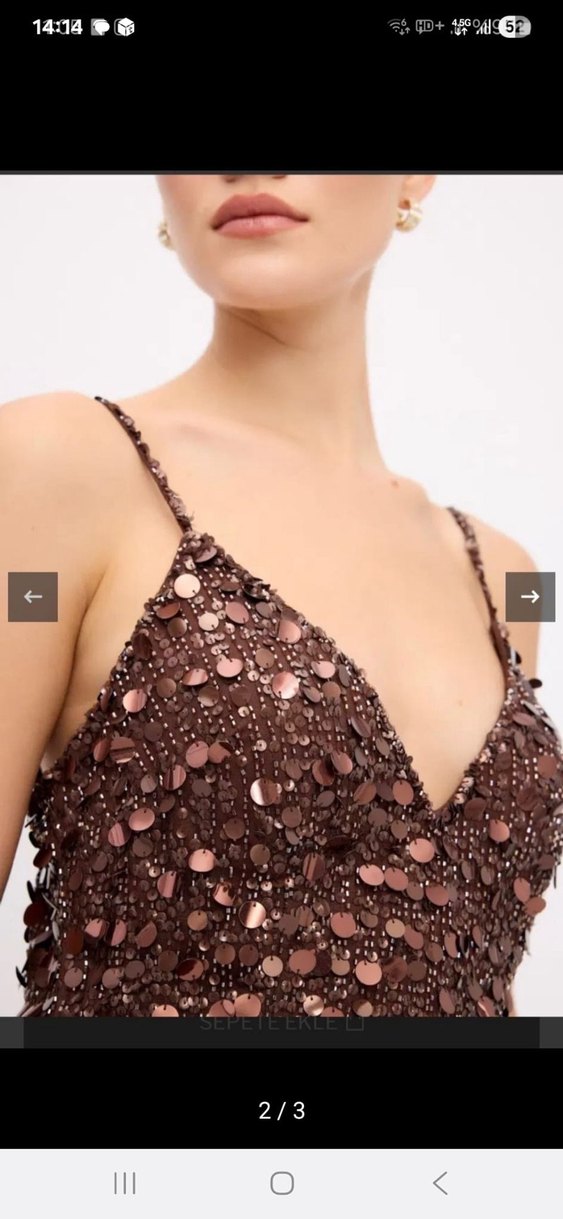 sirt fermuar kisminda tadilat var kilo aldigimdan dolayi capraz bir ek yaptirdim dileyen terzide eski haline getirebilir basit bir sekilde sirf bunun icin eksik fiyata koyacagim V yaka ve ince askılı, kahverengi, boncuk işlemeli uzun abiye elbise. Partiler için şık ve bohem tarzda, vücuda oturan kesim.