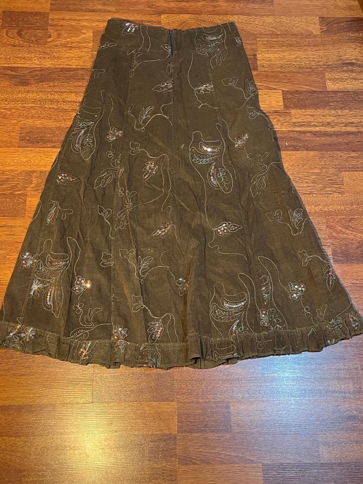 Boncuk İşlemeli Kahverengi Uzun Keten Etek