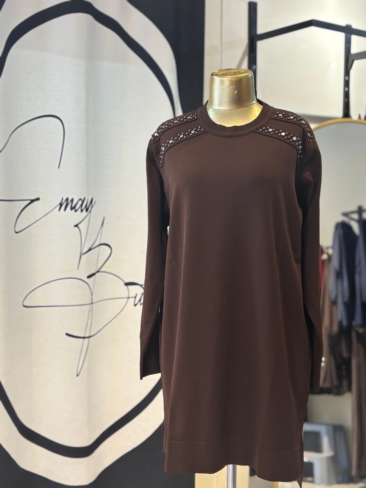 Boncuk İşlemeli Kahverengi Uzun Kollu Triko Tunik