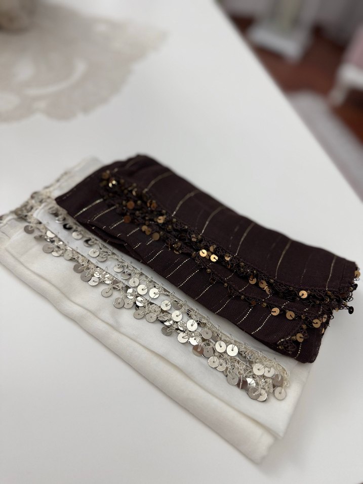 Kahverengi ve beyaz, boncuk ve payet işlemeli, ipeksi dokulu kadın fularları, vintage bohem tarzı için uygundur.