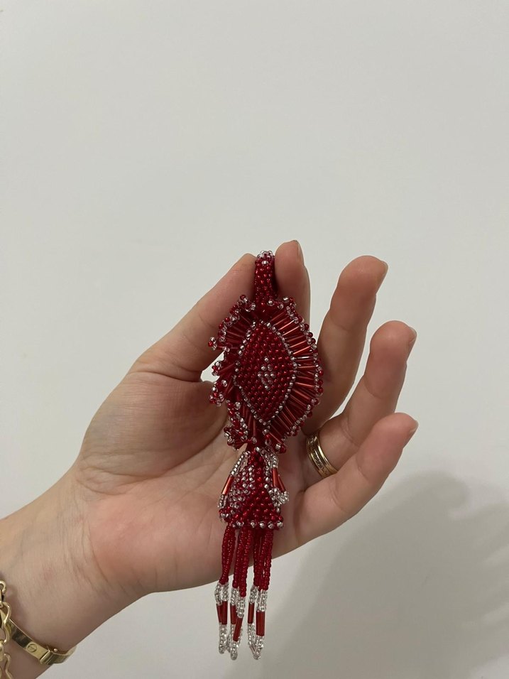 Kırmızı boncuk işlemeli, renkli ve retro tarzda bohem anahtarlığıdır. Sallantılı boncuk detaylarıyla süslenmiştir.