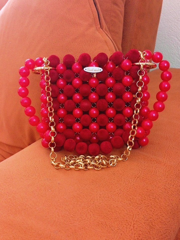 Renkli boncuklarla süslenmiş kırmızı çanta, örme kumaştan yapılmıştır. Bohem tarzı ve minimal dokunuşuyla romantik akşamlar için uygundur. ❤️