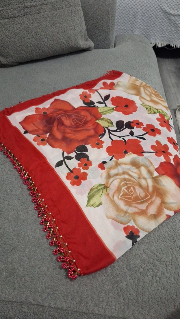 Kadınlar için çiçek desenli, büyük güller ve küçük çiçeklerle renkli tasarıma sahip yumuşak sentetik kumaş fular. Kırmızı kenarı boncuk işlemeli, bohem stile uygun. hiç kullanılmadı