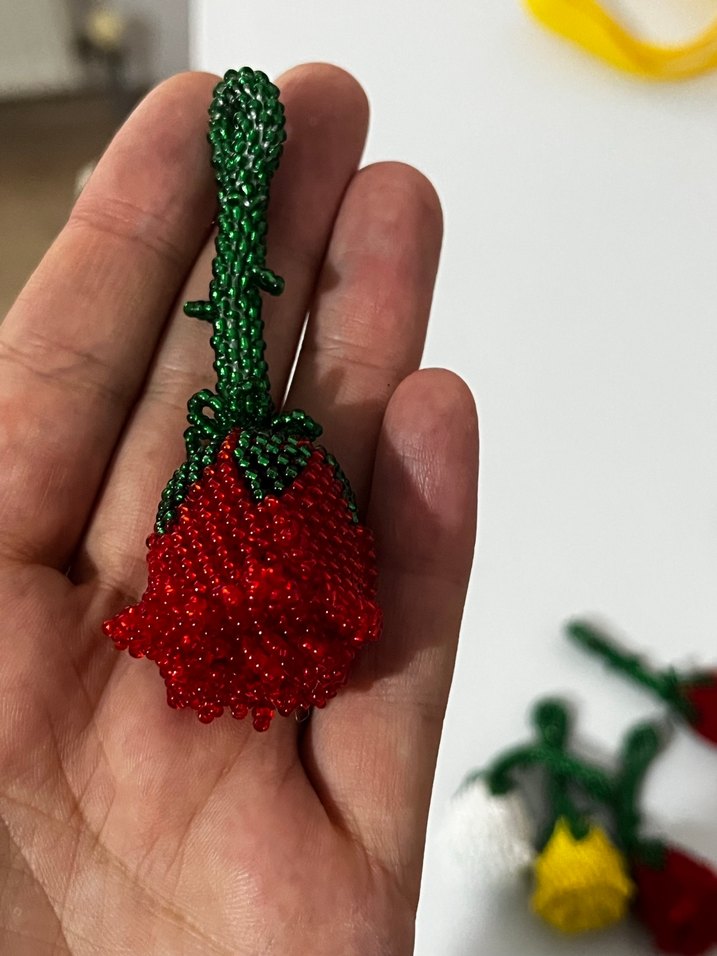 Boncuklarla işlenmiş kırmızı gül şeklinde, bohem tarzda renkli ve retro bir anahtarlık.